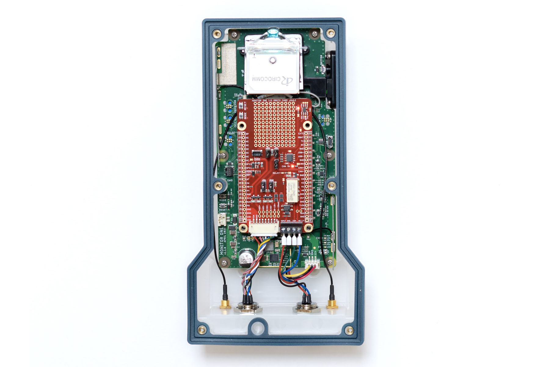 - Plug the M12 8-pin connector into the Monitor One (label up, toward the cellular SMA connector).